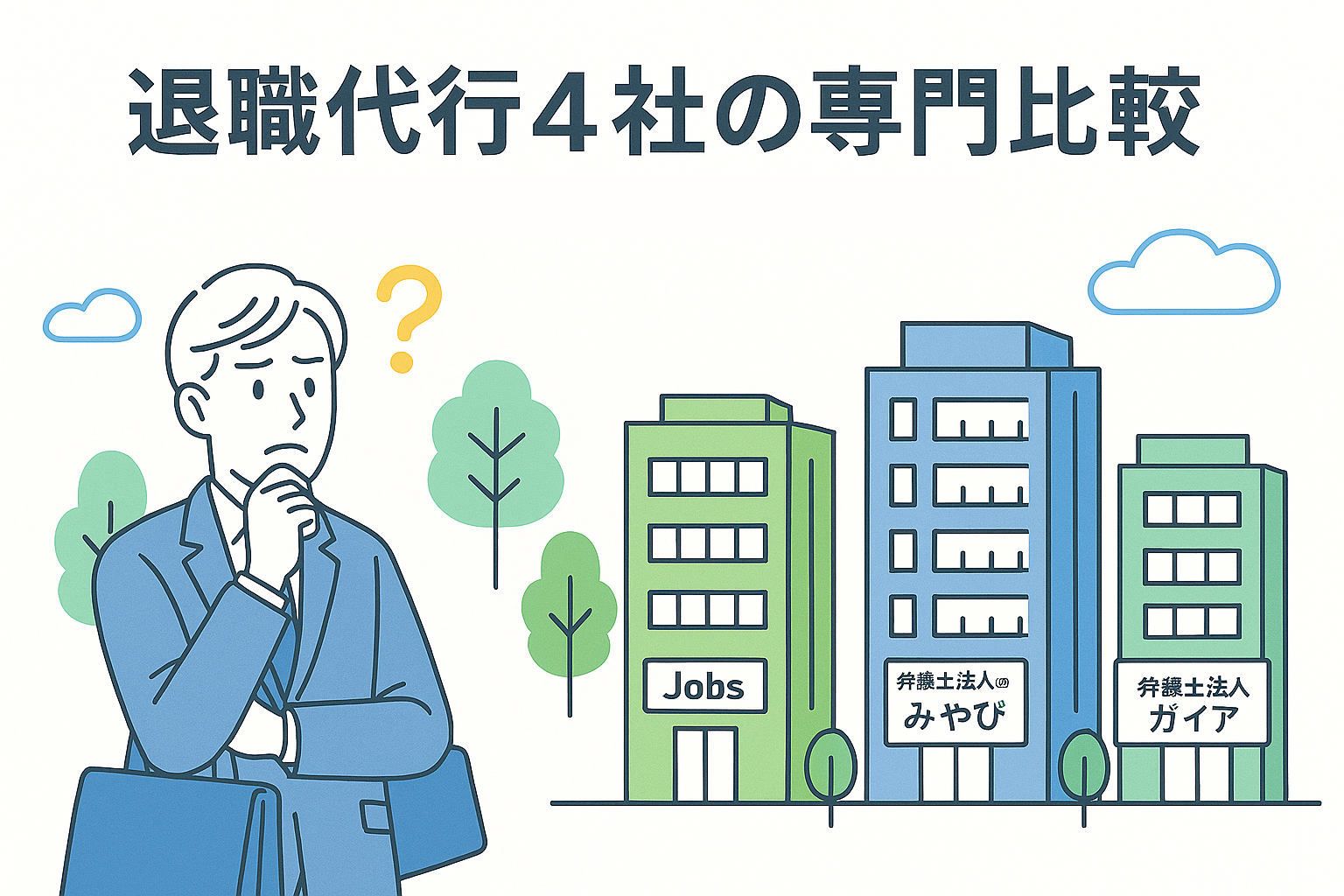 | 項目 | 退職代行Jobs | 退職代行ガーディアン | 弁護士法人みやび | 弁護士法人ガイア法律事務所 |